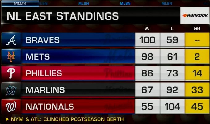 Even though the Braves are up by two games with three games remaining, the race for the NL East is far from over, and the Mets still could win the division. There are three games remaining for both teams. Braves magic number is one, and any combination of Braves win or Mets loss today, will crown the Braves Kings of the East for the fifth straight year.